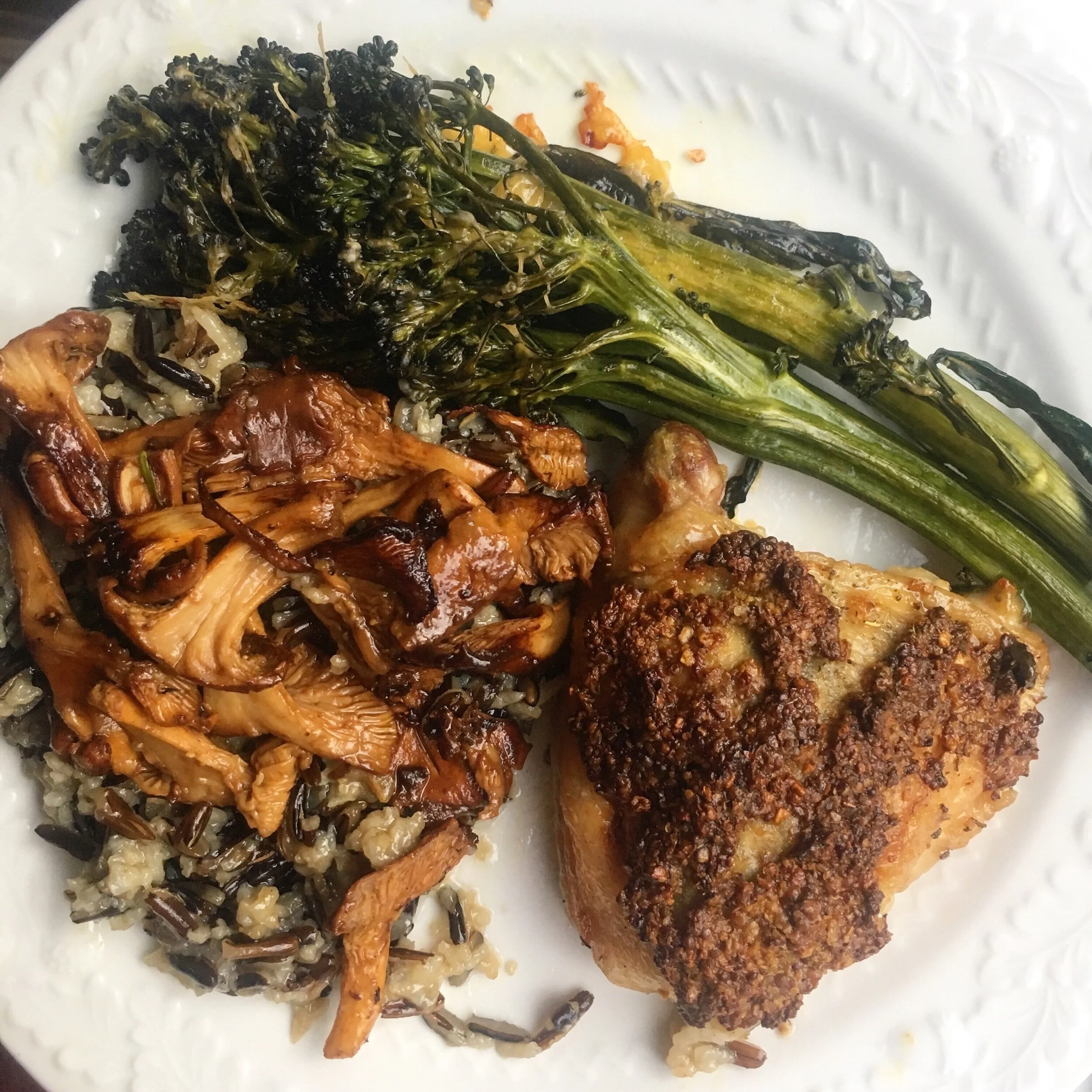 Tonight’s dinner of cheesy broccolini, wild rice with chanterelles, and mustard chicken thighs