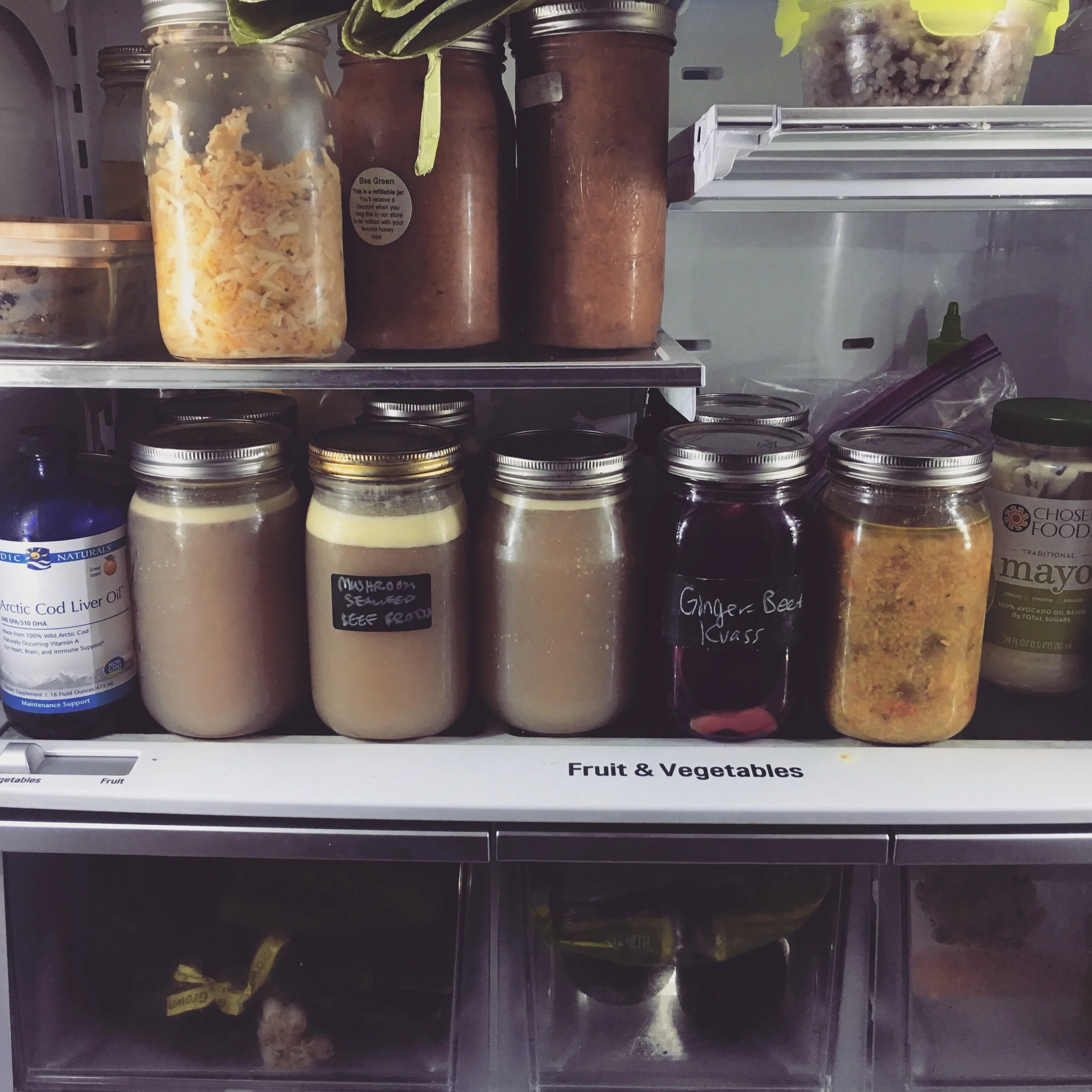 A current snapshot of my fridge, Contents in case you’re interested (from top left): baked sweet potato, apple parsnip kraut, apple-quince sauce, leftover buckwheat, cod liver oil, bone marrow and oxtail pho broth, mushroom seaweed beef broth (from second batch), ginger beet kvass, leftover chicken soup, avocado oil mayo.